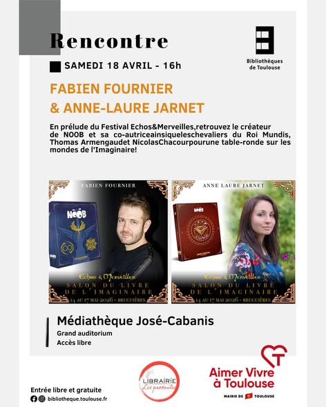 Rencontre avec Fabien Fournier et Anne-Laure Jarnet Samedi 18 avril à la médiathèque José-Cabanis à Toulouse !!!