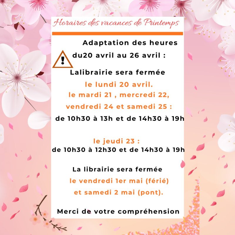 - Heures d'ouverture modifiées le matin et le midi sur la première semaine de vacances du 20 au 26 avril.
